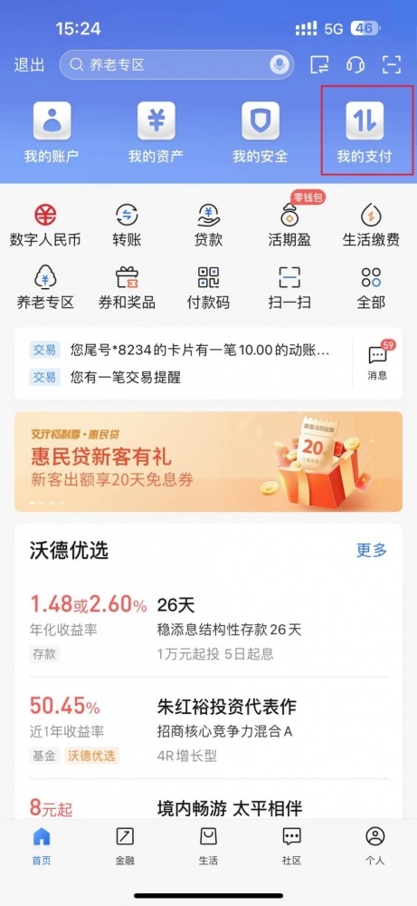 第一步:登錄交通銀行手機(jī)銀行APP-首頁(yè)-我的支付-付款碼