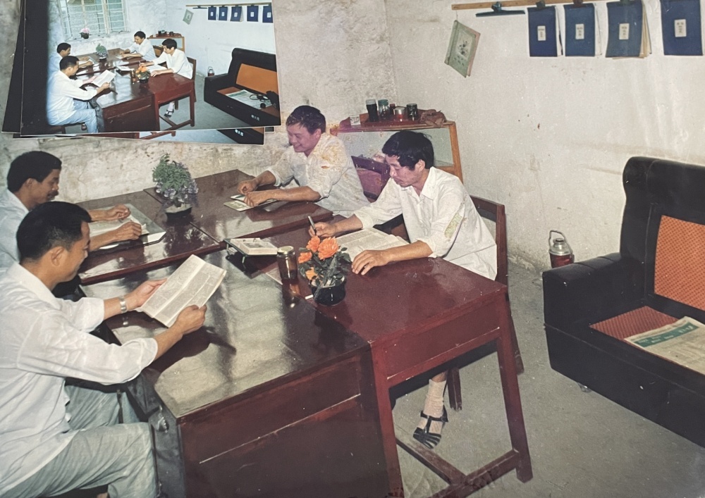 ▲80年代,機(jī)關(guān)辦公室工作場景。新舊都不一樣的四張桌子拼成一張大長桌,大家面對面圍坐著辦公。桌面上的兩盆鮮花植物,算是為數(shù)不多的裝飾。