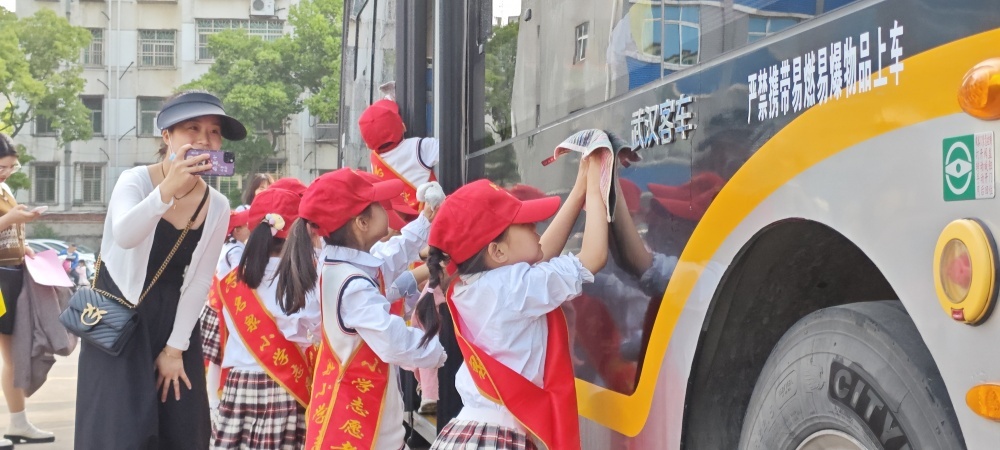 圖/同學們體驗公交車清潔過程,自備小抹布為車身擦拭水漬,共護公交出行環(huán)境,倡導綠色出行。