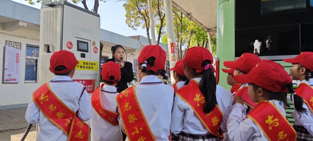 圖/在公交充電站,工作人員向同學們介紹充電樁的工作原理和純電動公交車的運行優(yōu)點。