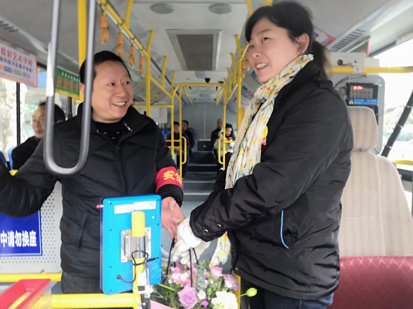 “我代表公司全體男職工,祝你們節(jié)日快樂,永遠美麗??!這籃鮮花送給你~”公交信息技術部男職工羅皓這樣說道,并將一籃鮮花送到正在跑班的公交女駕駛員蘇純菊手中。面對這突來的鮮花和祝福,蘇純菊滿臉驚喜和溫馨,“謝謝,謝謝你們”在道謝聲中,關上車門,微笑著駛向下一站。