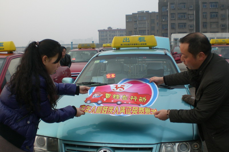 昨日7時(shí)30分,市出租汽車公司雷鋒車隊(duì)的20臺(tái)雷鋒車和20臺(tái)優(yōu)秀出租汽車匯集到泉口一路市出租汽車公司院內(nèi),統(tǒng)一粘貼心形的"3-5雷鋒在行動(dòng)""老年人和殘疾人免費(fèi)乘坐"活動(dòng)標(biāo)識(shí)(如圖),經(jīng)過簡(jiǎn)短的啟動(dòng)儀式后,駕駛員們整裝出發(fā),在城區(qū)運(yùn)行,對(duì)老年人、殘疾人和到醫(yī)院就醫(yī)但行動(dòng)不便的病人實(shí)行免費(fèi)接送服務(wù)。