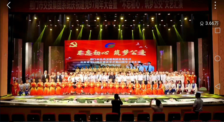 6月26日,市公共交通集團有限公司在荊門劇院舉行慶祝建黨97周年表彰大會暨“不忘初心,筑夢公交”文藝演出,來自11個基層單位員工獻出了一場炫目多彩的紅色文化視聽盛宴。
